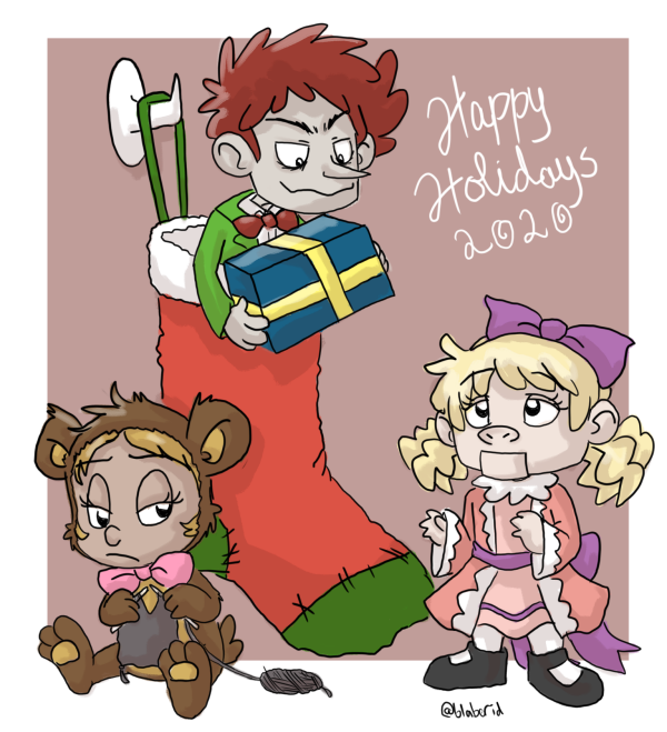 This was drawn soooo last minute, like in the final hours of December 31st, so it's a bit rushed, but hey, it counts. Jack in the Box and his two siblings in a little holiday scene.