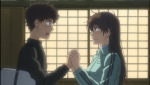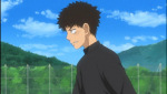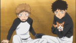 After the practice, the battery returns to the cabin, where Shiga holds a goofy speech and they eat and stuff. Afterwards, there's some heartwarming Nishiura team bonding, while Mihashi sulks in a corner and Momoe and Abe have a talk about what it means to be a catcher (Abe having a really quick Haruna flashback in the process). Momoe grabs Abe's hands and says it'll be all right and that he should try doing exactly this to Mihashi. Abe's all like "WTF?"