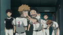 Bottom of the seventh inning! Junta bats fools around first, and it's Yamanoi's turn next. He hits and makes it to the base without even opening his eyes! Jin's next, then Masaya. This is the part when Mihashi slips and falls, losing control of the ball completely, resulting in another point for Tosei! Which MEANS, Tosei is now in the lead! Dun dun DUN!! Sakaeguchi runs off to see if Mihashi is okay, and Abe runs off to do some yelling and hand-feeling. They decide to let the batter walk. Shingo's up next, and as he bats, the bat goes flying right out of his hand! That's DANGEROUS! The Mr. Referees form a huddle to discuss whether or not they should let the match continue because of the dreaded rain.