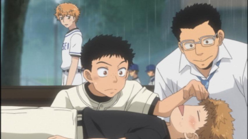 The episode begins with Tosei forming a huddle and agreeing on the fact that things got harder than they expected, but they'll definitely win! Mihashi, meanwhile, spends some time being dramatic before he starts pitching. He secretly disagrees with the way Abe wants him to pitch, but since he's Mihashi, he does as he is told anyway. Abe notices his slight hesitation though, and gets all ANGRY. Anyway, Jin's up first! AWW, JIN!! He hits and runs off to base one. Mihashi flails around pathetically like a Magikarp, but Abe, threatening to switch him out with Oki or Hanai, verbally manages to pull Mihashi back up. There's NO WAY Mihashi's going to let someone ELSE pitch!