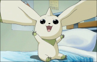 Terriermon's theme song! Yay! It's very cute and silly, the kind of song perfect for a cute little cartoon dog monster. He sings about how wonderful it is to play around and eat and sleep all day long, and how everything will be all right with some moumantai. Towards the end there's this action-packed sequence where he goes all hardcore and evolves into Galgomon! Then he gets tired and calms down.Lyrics Aoi sora tobou moumantai Tsukaretara amai juusu kanpai Fuwari fuwari aa-aa tanoshii na Zutto issho ni asobou Okay, all right, moumantai Yume ja nai yo soba ni iru Futari no aikotoba "Anytime moumantai" Kore dake de genki hyaku bai Ame furi no hi mo moumantai Oyatsu wo ne tabete onaka manpai Torori torori aa-aa nemutai na Chotto ohirune shiyo Okay, all right, moumantai Demo ne chanto soba ni iru Negoto demo ieru yo "Anytime moumantai" Sugoi desho donna mondai One two three GO! Terriermon shinka! Galgomon! I wanna fight to save my partner Abarechaun da dadadadadaaatte Chi ga sawagun da Dum Dum Upper Yaru toki ni wa yaranakucha Hito makase ja dame nan da Doko made mo ikou moumantai Omoshiroi koto ni itsumo banzai Fuwari fuwari aa-aa tanoshii na Zutto issho ni asobou Zutto tomodachi da kara |