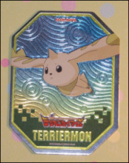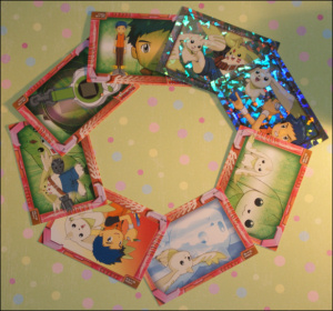 | TOYS - FLAT STUFF Cards and stuff. Joy. ![]() Terriermon and Jian-related cards By Amada Printing Random trading cards featuring the most heartwarming pair in the world! Each card has a little text about the characters on the back. ![]() Fancy octagon card By MARUMIYA Recycled illustration, but I love it! Terriermon's stats are written on the back. ![]() Miscellaneous illustration cards By Amada Printing Like the Terriermon and Jian cards, these cute cards also contain little blurbs on the back. ![]() Episode story cards By Amada Printing Pretty much the same as the other Amada Printing cards! |